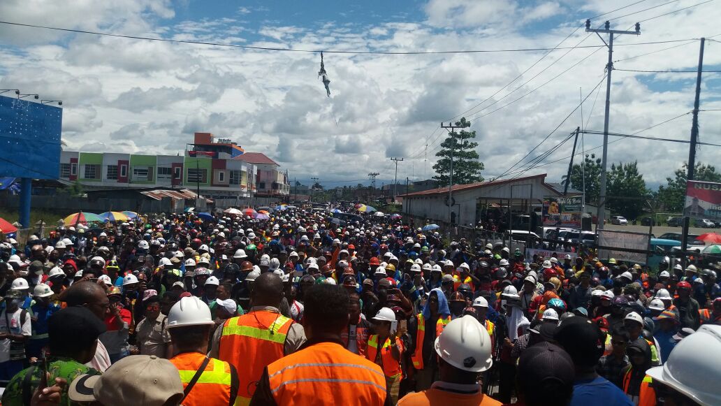 WARGA adat, karyawan PT Freeport Indonesia, serta pegawai kontraktor berunjuk rasa di bundaran Timika Indah, Timika, Kabupaten Mimika, Papua, Kamis (23/3).