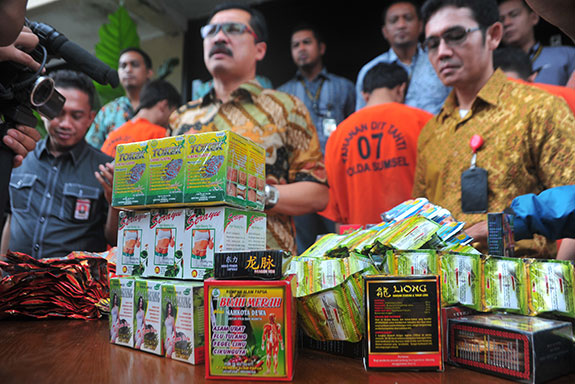 DIREKTORAT Reserse Kriminal Khusus Polda Sumatra Selatan menyita 9.305 kotak jamu ilegal dari sebuah rumah di Jalan Ki Marogan, Kertapati, Palembang, Minggu (18/12).