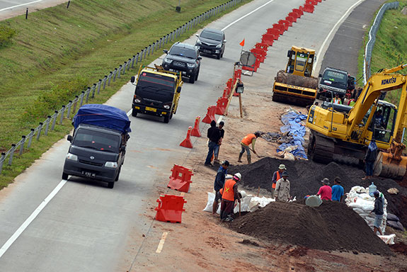 TANAH ambles terus terjadi di bahu jalan Tol Cikopo-Palimanan akibat gerusan hujan.