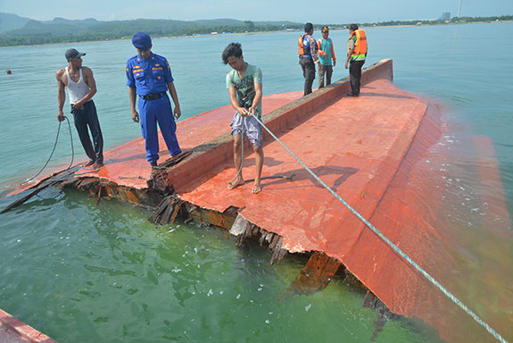 BANGKAI kapal nelayan Mulya Sejati yang mengalami tabrakan di wilayah perairan Tuban, Jawa Timur, ditemukan di perairan Rembang, Jawa Tengah, Kamis (24/11).