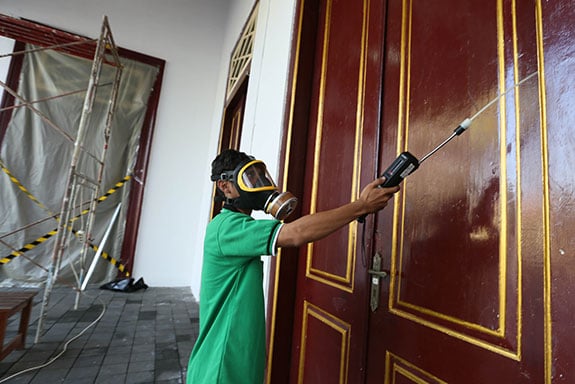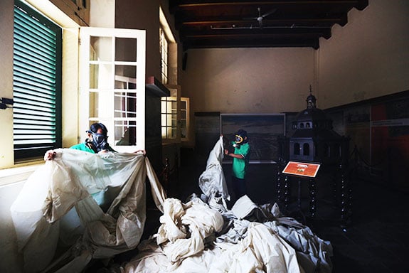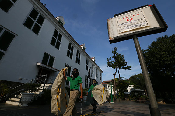 PETUGAS-PETUGAS bermasker khusus menanamkan tablet bahan kimia di permukaan lantai bangunan Museum Sejarah Jakarta beberapa waktu lalu.