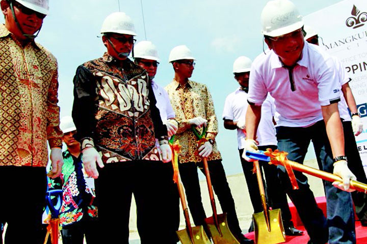 DIREKTUR Utama PT Kencana Graha Optima Harry Gunawan, didampingi Komisaris Utama PT Wisma Purnayudha Putra Hutomo Mandala Putra dan Wali Kota Jakarta Selatan Tri Kurniadi melakukan penutupan atap (topping off) Office Tower One Mangkuluhur City.