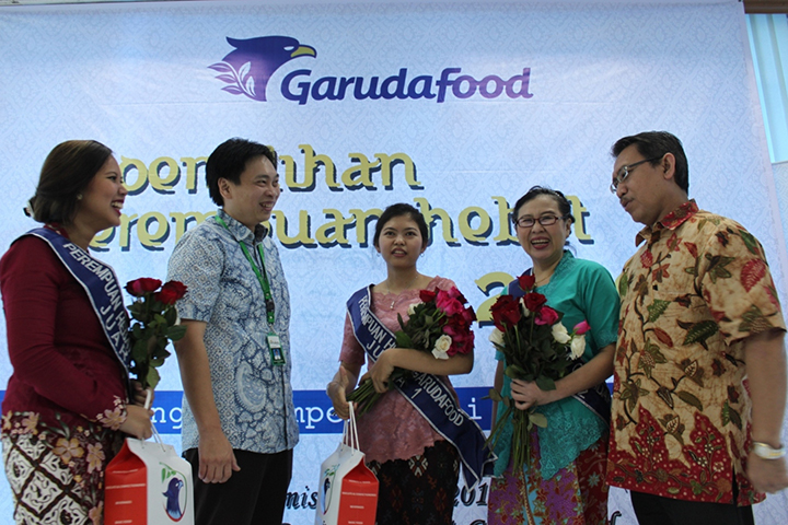 CEO Garuda Food Group Hardianto Atmadja dan Director Garuda Food Group Rudy Brigianto berbincang dengan finalis acara Perempuan Hebat Garuda Food yang diadakan menyambut Hari Kartini, di Jakarta, Kamis (21/4).