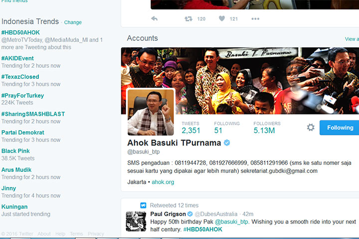 GUBERNUR DKI Jakarta Basuki "Ahok" Tjahaja Purnama, Eabu (29/6) berulang tahun yang ke-50 dan mendapat banyak ucapan dari netizen di Twitter.