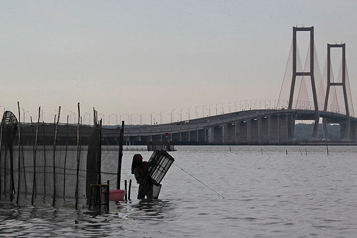 JEMBATAN Surabaya yang memiliki ikon air mancur menari warna-warni ini di kawasan pantai Kenjeran Surabaya siap diresmikan setelah libur Hari Raya Idul Fitri, Sabtu (9/7) malam.