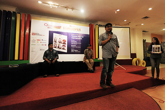 SEJUMLAH komunitas dan pecinta fotografi di Daerah Istimewa Yogyakarta (DIY), mengikuti diskusi buku fotografi jurnalistik berjudul Spektrum Kehidupan, di ruang Archimedes Taman Pintar Yogyakarta, Minggu (29/05).