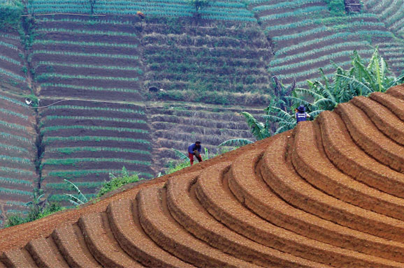 SEJUMLAH helikopter, Selasa (14/2), mulai menjatuhkan karung raksasa berisikan pasir untuk menopang