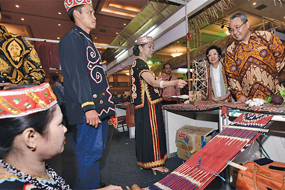 MENTERI Desa, PDT, dan Transmigrasi Eko Sandjojo mengamati salah satu produk unggulan perdesaan seusai membuka Expo Potensi Desa 2016