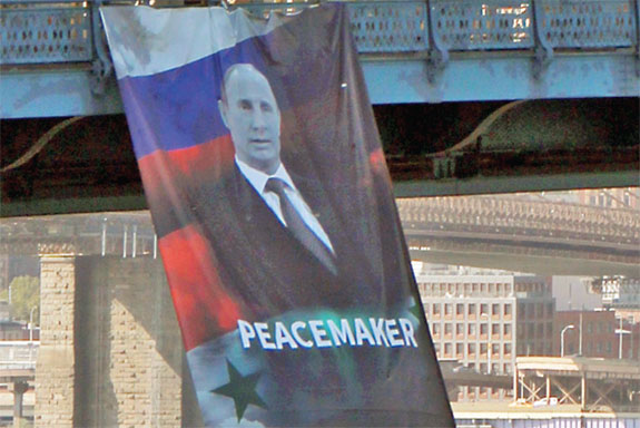 WARGA Kota New York, Amerika Serikat, dikejutkan dengan spanduk besar bergambar Presiden Rusia Vladimir Putin