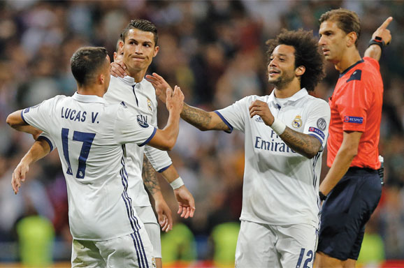 BERJUANG dengan mental juara hingga menit akhir ditunjukkan Real Madrid saat menjamu Sporting