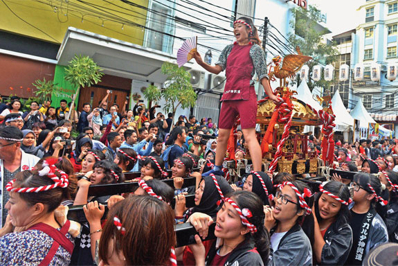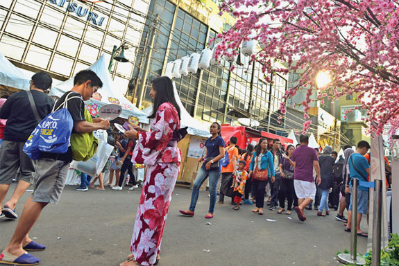PULUHAN orang mengenakan pakaian tradisional Jepang, kimono. Mereka berdiri berderet rapi tepat di depan lobi utama Blok M