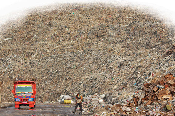 BAU busuk menyelimuti truk berukuran besar berwarna oranye milik Dinas Kebersihan DKI Jakarta.