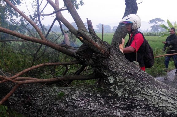 HUJAN deras dan angin kencang di wilayah Yogyakarta, Daerah Istimewa Yogyakarta, dan sekitarnya telah menumbangkan