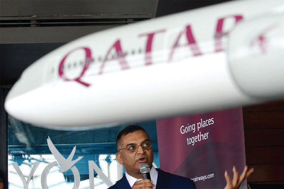 COUNTRY Manager Qatar Airways Indonesia Ramdas Shivram memberikan keterangan kepada wartawan saat peluncuran kampanye