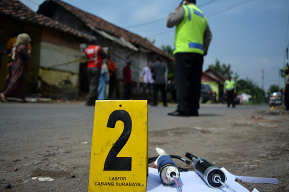 TIM Pusat Laboratorium dan Forensik (Puslabfor) Polda Jawa Timur melakukan olah tempat kejadian perkara