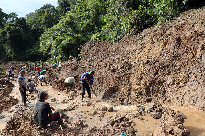 MATERIAL longsor sepanjang 50 meter menimbun jalur yang meng-hubungkan dua kabupaten, yaitu Lebong menuju Rejang Lebong, Bengkulu.