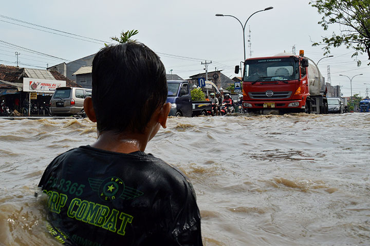 HUJAN berintensitas tinggi di hulu sungai di kawasan Pegunungan Arjuna membuat Sungai Welang di perbatasan Kota dan Kabupaten Pasuruan, Jawa Timur, meluap