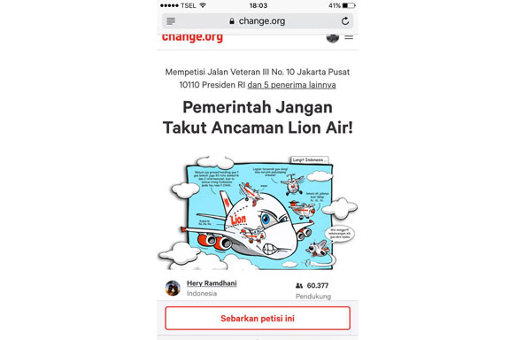 • Petisi Pemerintah Jangan Takut Ancaman Lion Air Tembus 60 Ribu