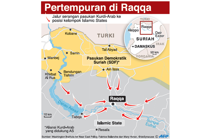 PASUKAN aliansi Arab-Kurdi yang didukung Amerika Serikat (AS) bergerak lebih dekat ke Kota Raqqa, Suriah, kemarin. Selain Mosul, Raqqa merupakan kota penting sekaligus benteng pertahanan terakhir bagi IS.