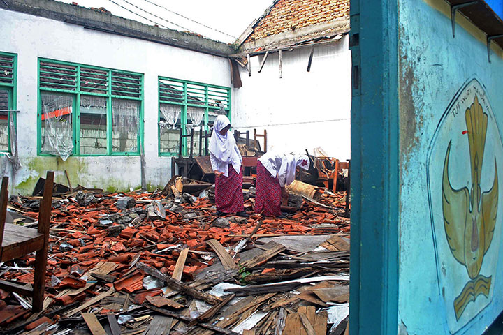 PECAHAN genting, potongan-potongan kecil tripleks bekas plafon, dan potongan kayu kerangka atap berserakan menutupi lantai pada empat ruangan di Sekolah Dasar Negeri (SDN) 2 Loji, Kota Bogor, Jawa Barat.