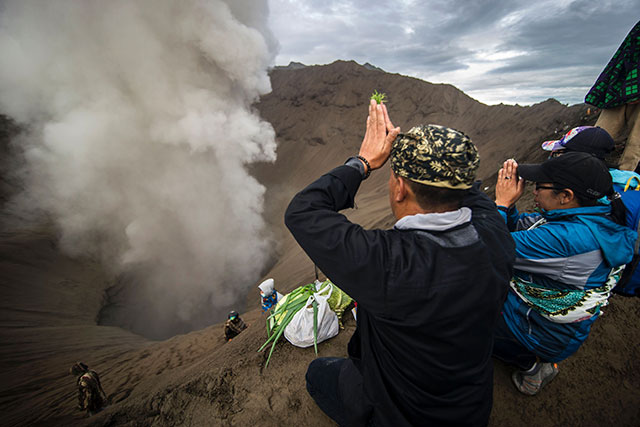 MESKI asap belerang tebal terus mengepul dari kawah Gunung Bromo, warga suku Tengger tetap melarung sesaji sebagai puncak ritual Yadnya Kasada Tahun Saka 1636