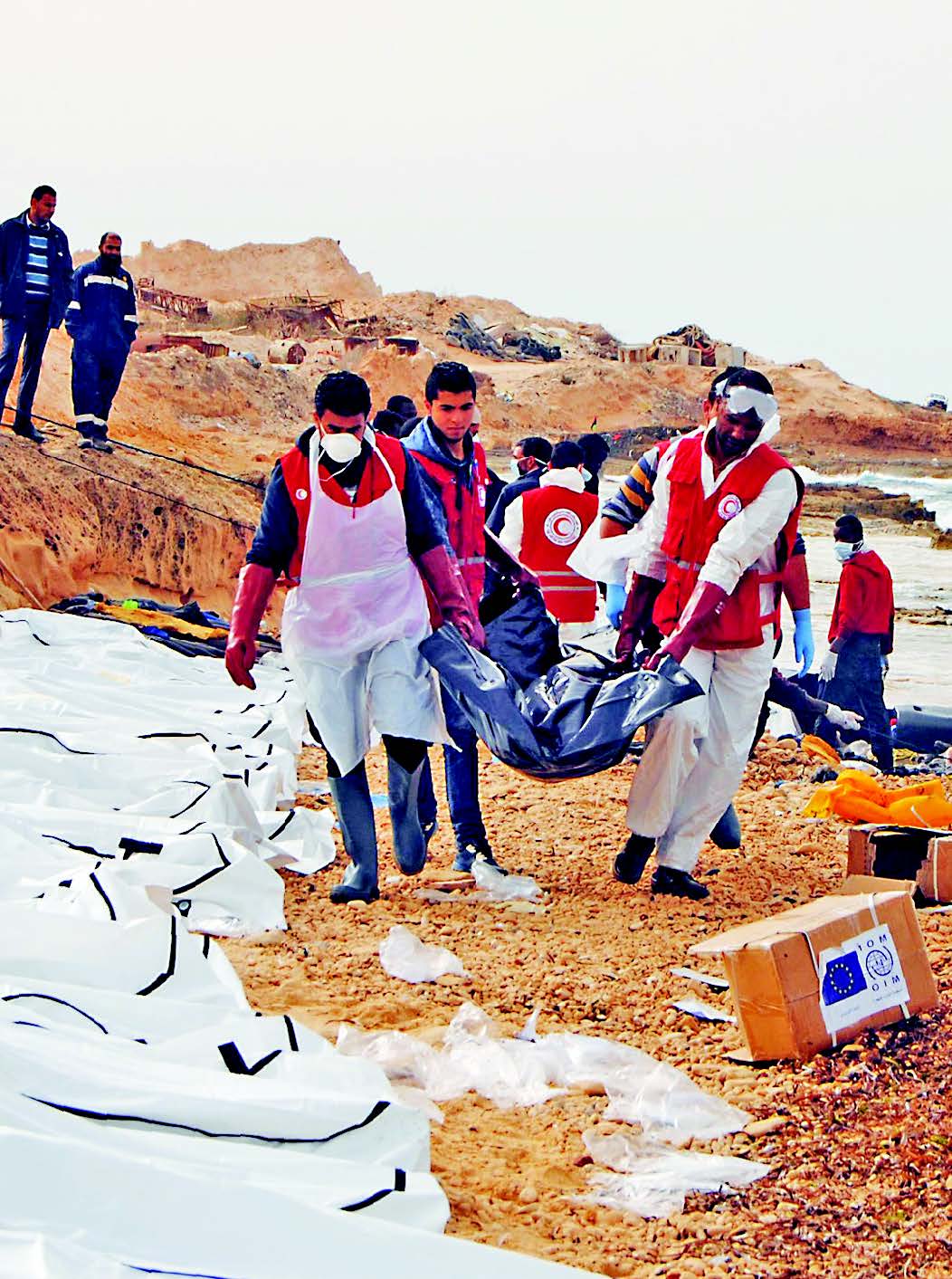 JENAZAH 74 migran yang tenggelam di Laut Mediterania saat sedang dalam perjalanan ke daratan Eropa terdampar di pantai barat ibu kota Libia, Tripoli.