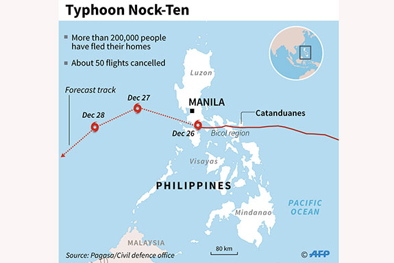 TERJANGAN topan Nock-ten, topan berkekuatan 235 kilometer per jam, di Manila menewaskan sedikitnya empat orang dan delapan lainnya hilang.