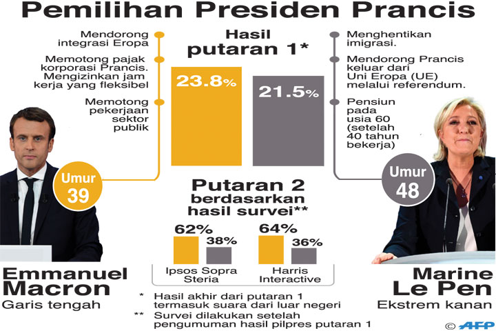 DALAM pemilihan presiden (Pilpres) Prancis, Minggu (23/4), Emmanuel Macron, 39, meraih suara terbanyak dengan 23,9%. Posisi kedua ditempati tokoh sayap kanan, Marine Le Pen, dengan 21,4% suara.