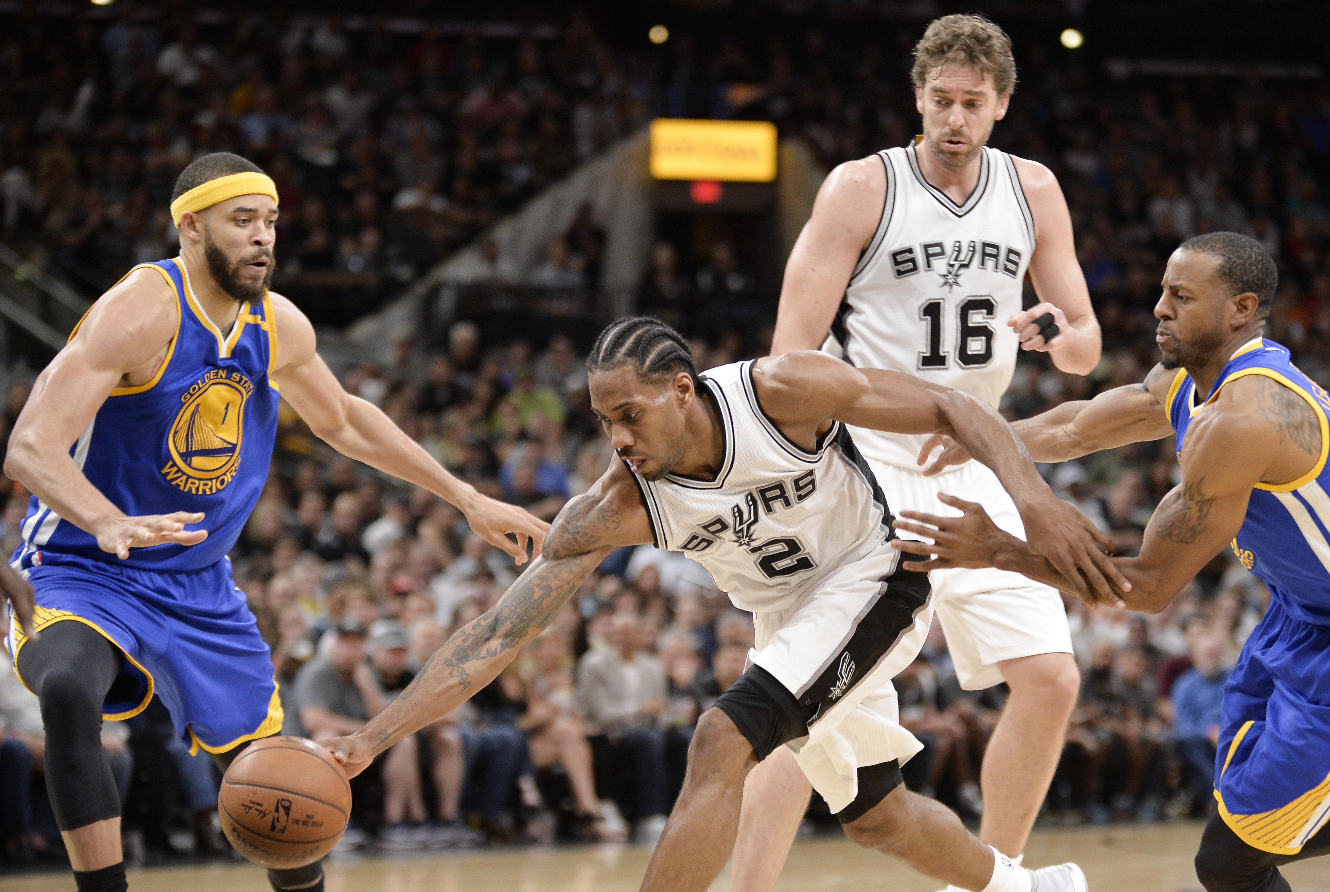 PERSAINGAN sengit mewarnai perjumpaan dua tim penguasa klasemen sementara Wilayah Barat kompetisi NBA, Golden State Warriors dan San Antonio Spurs.