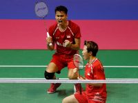 SETELAH smes keras di bagian tengah bidang lawan tak bisa dikembalikan, Tontowi Ahmad menjatuhkan badan ke lapangan, menengadah dengan kedua kaki diangkat.